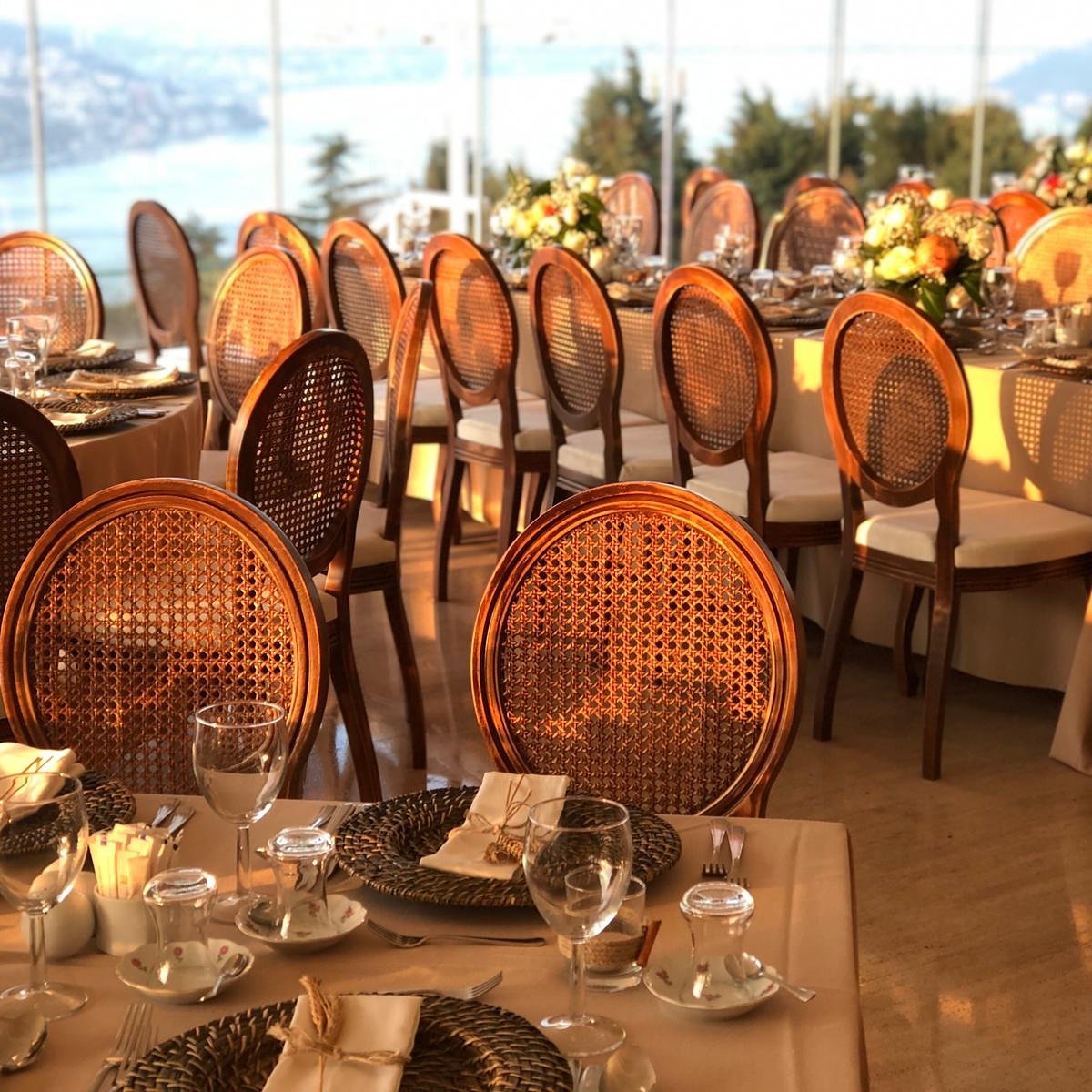 Çok Yönlü Uyum: Yuvarlak banket masalar veya uzun şölen masalarıyla mükemmel uyum sağlar. Beyaz örtüler, ahşap suplalar ve doğal çiçek aranjmanlarıyla kombinlendiğinde göz kamaştırıcı durur.